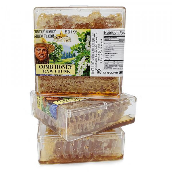 This is basically a square cut chunk of the hexagonal shaped beeswax cells of the honeycomb, each filled with concentrated nectar of thousands of flowers, exactly as the bees packed it intended for consumption. It is the purest, most raw form of honey available without additional processing for raw honey enthusiasts. Naturally fat, cholesterol and gluten free; it is saturated with every bit of pollen, enzymes, propolis, vitamins, amino acids, antioxidants, minerals, and aromatics that the bees produced in the hive.
